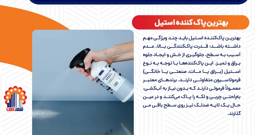 بهترین پاککننده استیل باید چند ویژگی مهم داشته باشد: قدرت پاککنندگی بالا، عدم آسیب به سطح، جلوگیری از خش و ایجاد جلوه براق و تمیز. این پاککنندهها با توجه به نوع استیل (براق یا مات، صنعتی یا خانگی) فرمولاسیون متفاوتی دارند. برندهای معتبر معمولاً فرمولی دارند که بدون نیاز به آبکشی، بهراحتی چربی و لکه را پاک میکنند و در عین حال یک لایه ضدلک نیز روی سطح باقی میگذارند.